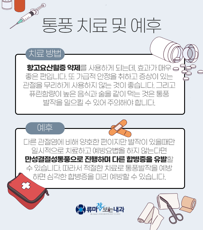 또 통풍의 예후가 다른 관절염과 비교했을 때 양호한 편인데요. 하지만 증상이 있을때만 일시적으로 치료를 받고 평소 제대로 관리하지 않는다면 결국 만성결절성통풍으로 발전하게 된답니다. 그리고 이렇게 만성결절성통풍으로 발전하게 되면 여러 합병증을 유발하게 될 수 있는데요. 반대로 적절하게 치료를 하는데 도움을 받으면서 통풍 증상이 나타나는 것을 예방하게 된다면 심각한 합병증이 발생하는 것 역시 미리 예방하는데 도움을 받아보실 수 있습니다.