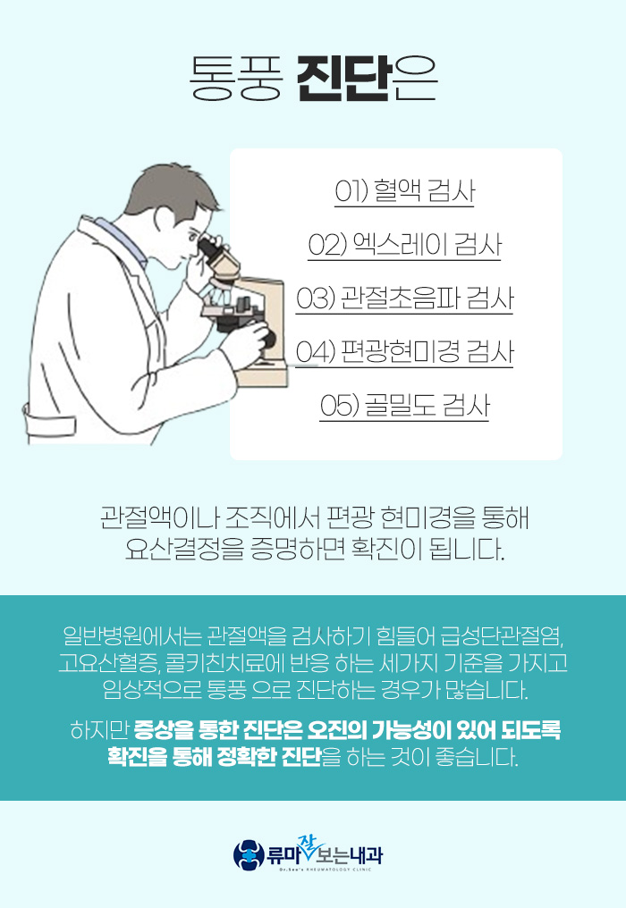그리고 대구통풍의원에서 환자분이 앓고 있는 증상이 통풍으로 인한 것이 맞는지 진단을 하게 될 때 편광 현미경을 사용하고 있습니다. 하지만 일반 병원으로 내원할 경우 아무래도 관절액으로 검사를 하는 것이 힘들다 보니 세 가지 기준으로 임상적으로 통풍을 진단하게 되는 경우가 많답니다. 이렇게 증상을 통해 진단을 하게 되면 오진의 가능성이 있는 만큼 되도록 확진을 통해서 진단을 받도록 해야 합니다.