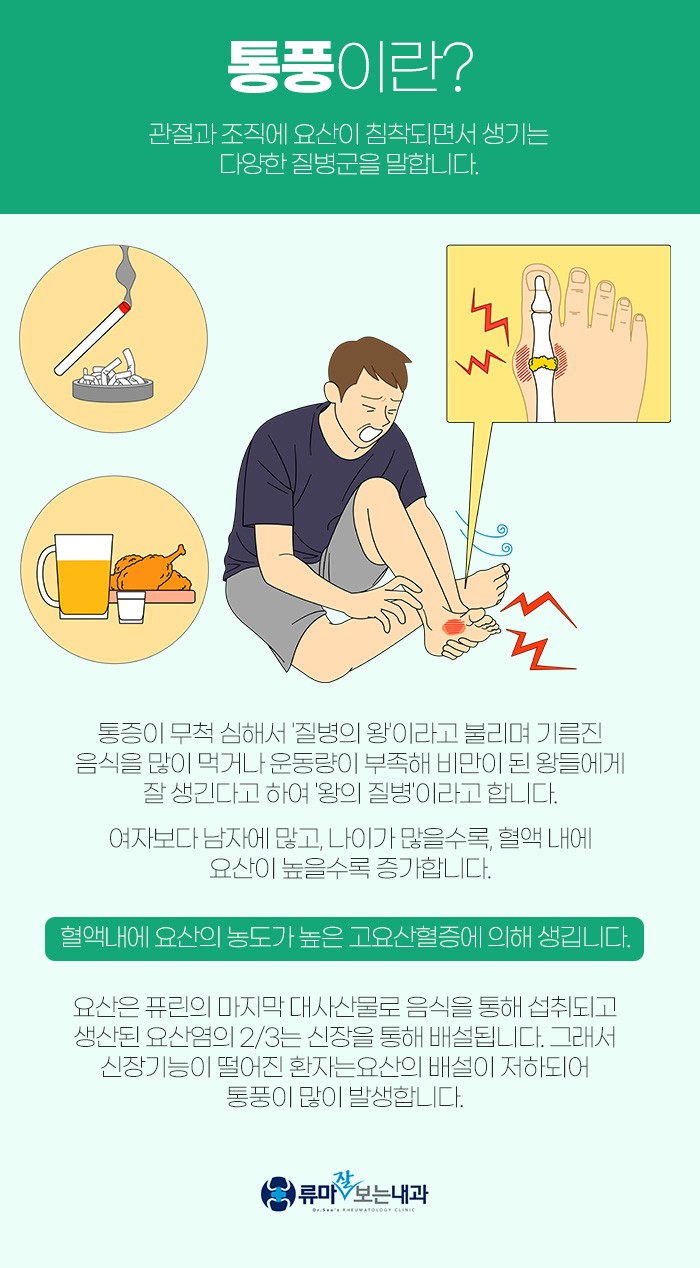 통풍은 혈액 내에 요산의 농도가 높은 고요산혈증에 의해 발생하게 되는데, 여기서 요산은 퓨린의 마지막 대사 산물이랍니다. 음식을 통해 섭취되고, 생산된 요산량의 2/3가 신장을 통해 배설되는데요. 그래서 신장 기능이 떨어지게 될 경우 요산의 배설 또한 저하되면서 통풍이 생기게 되는 경우가 많답니다.