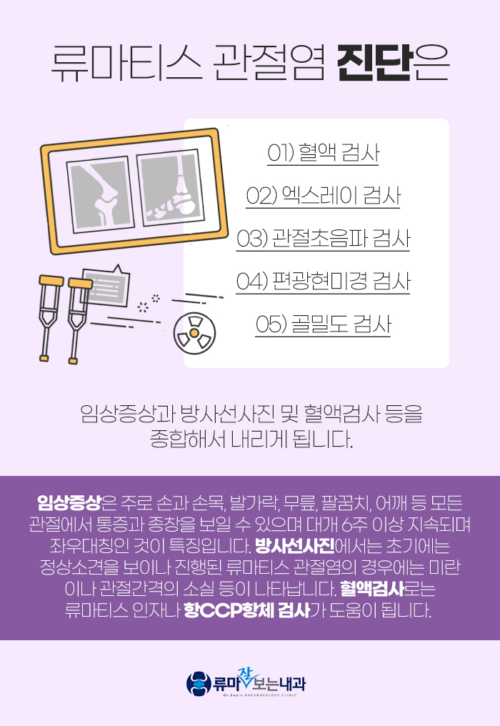 그리고 방사선 사진은 초기에 정상 소견을 보이지만 진행되면 보다 진행되면 미란이나 관절 간격 소실 등이 나타나게 되는데요. 또 혈액 검사로는 류마티스 인자나 항CCP 항체 검사가 도움이 된답니다. 그리고 류마티스 인자가 양성인 경우에는 류마티스 관절염으로 알고 계신 경우가 많은데요. 정상인에게도 5% 미만에서 양성을 보일 수 있답니다. 그렇기에 증상이 동반되는 경우에만 의미가 있다고 보시는 게 좋습니다.