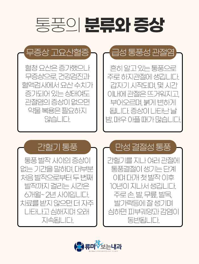 또 대구통풍은 무증상 고요산혈증과 급성 통풍성 관절염, 간헐기 통풍, 만성 결정성 통풍으로 구분할 수 있는데요. 무증상 고요산혈증은 혈중 요산이 증가되었지만 관절염 증상이 없는 상태를 말합니다. 건강검진이나 혈액 검사에서 요산 수치가 증가되어 있다고 하더라도 관절염 증상이 없다면 약물 복용을 할 필요가 없습니다.