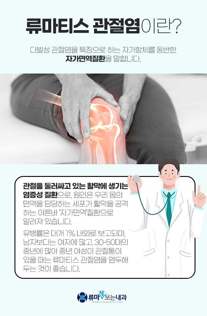이러한 류마티스 관절염에 대해 자세히 설명해 보자면 자가항체를 동반한 자가 면역 질환인데, 관절을 둘러싸고 있는 활막에 염증이 생기게 된답니다. 그 이유는 우리 몸에서 면역을 담당하고 있는 세포가 활막을 공격하기 때문이랍니다.