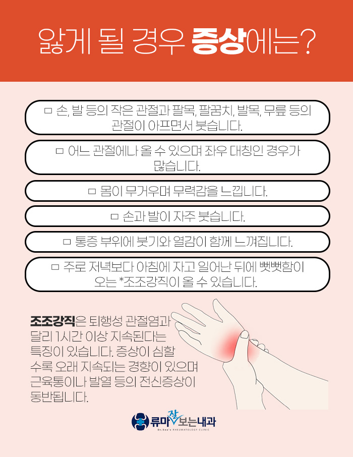 그리고 다음과 같은 증상이 나타난다면 대구류마티스잘보는곳을 찾아주시는 게 좋습니다.