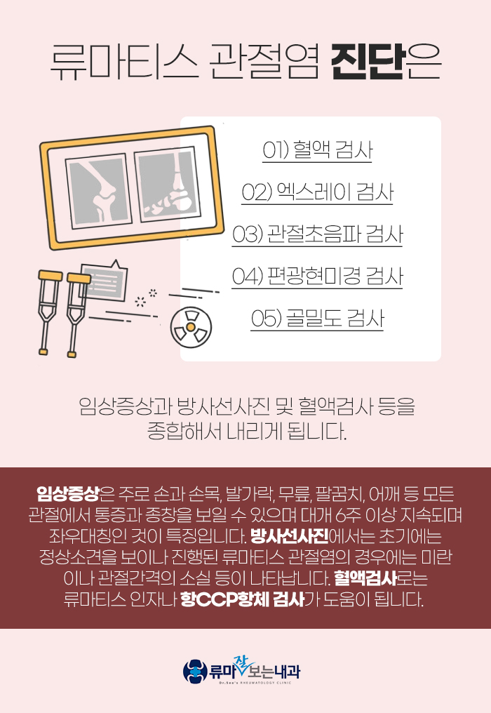 또한 혈액 검사는 류마티스 인자나 항CCP 항체 검사가 도움이 되는데요. 이때 류마티스 인자가 양성으로 나온다면 류마티스 관절염이라 생각하시는 경우가 많은데 정상인에게도 5% 미만에서 양성을 보일 수 있답니다.