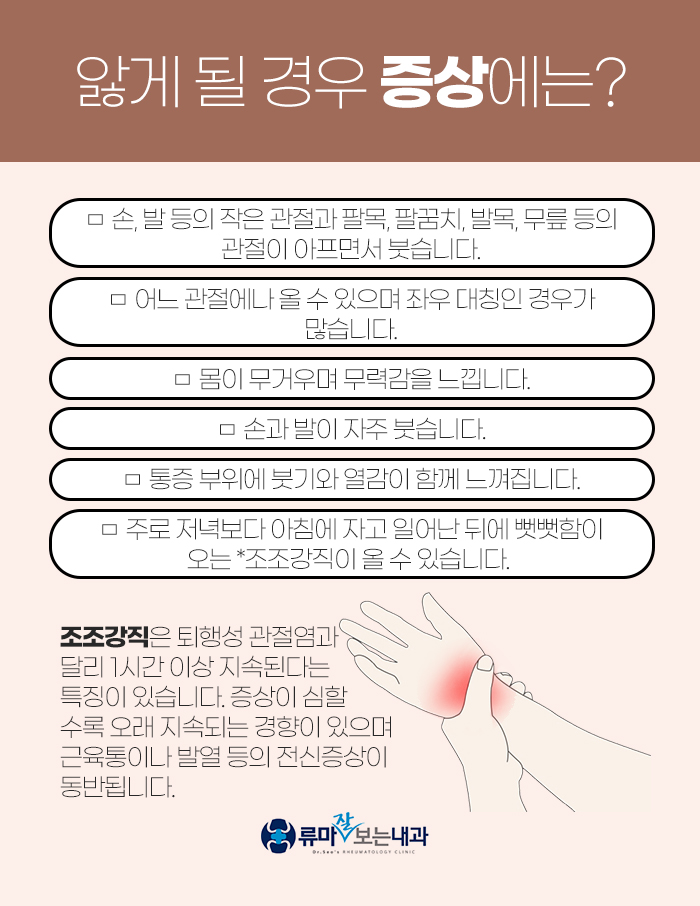 그리고 다음과 같은 증상이 나타난다면 대구류마티스내과 로 내원하셔서 진단을 받아보시는 게 좋은데요.