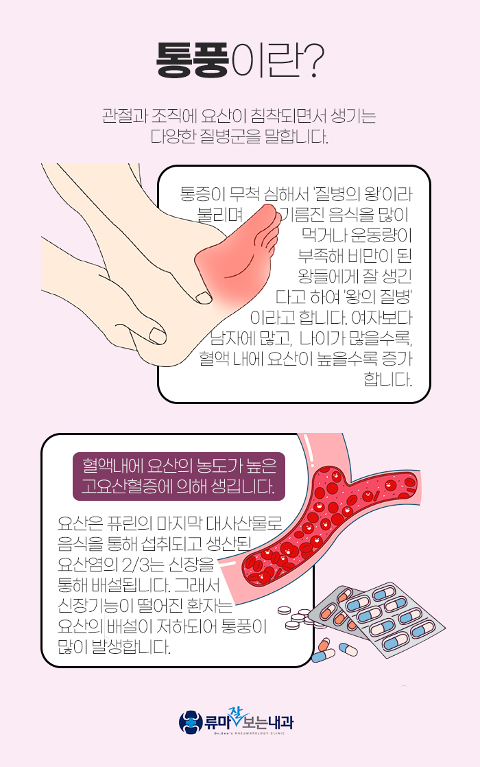그리고 통풍이 발생하게 되는 이유는 혈액 내 요산의 농도가 높은 고요산혈증에 의해서인데요. 요산은 퓨린의 마지막 대사산물을 말하는데, 음식을 통해 섭취된답니다. 또 생산된 요산염의 2/3가 신장을 통해 배설되는데요. 그런 만큼 신장 기능이 떨어지게 되면 요산을 배설하는 것도 저하되면서 통풍이 발생하게 되는 경우가 많습니다.