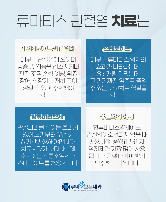 그리고 환자분이 앓고 있는 것이 대구류마티스가 맞다면 비스테로이드성 항염제와 스테로이드, 항류마티스제, 생물학적 제제를 통해서 도움을 받아보실 수 있는데요.