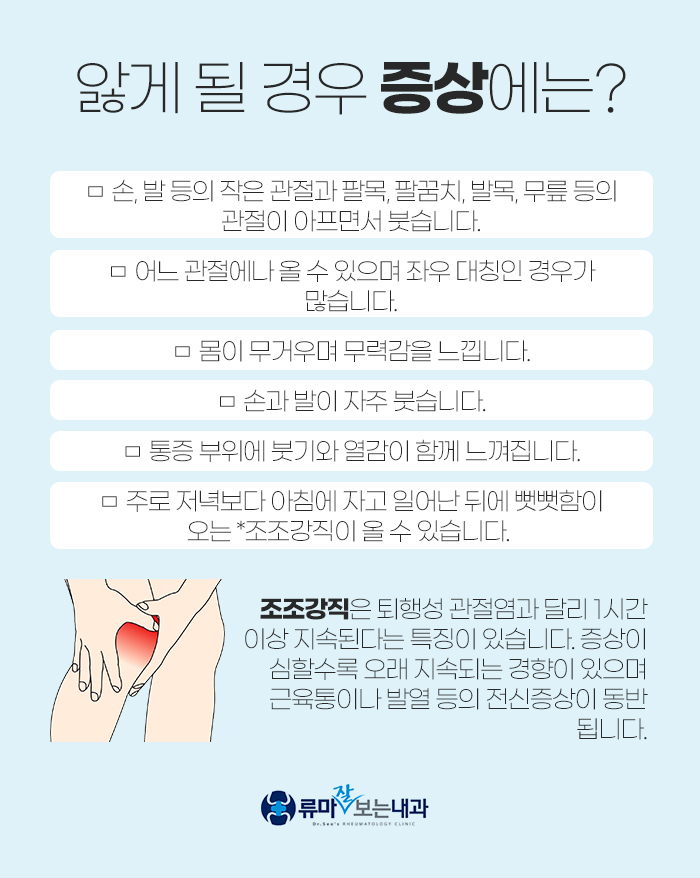 그리고 류마티스 관절염을 앓게 될 경우 다음과 같은 증상이 나타나게 되는데요.