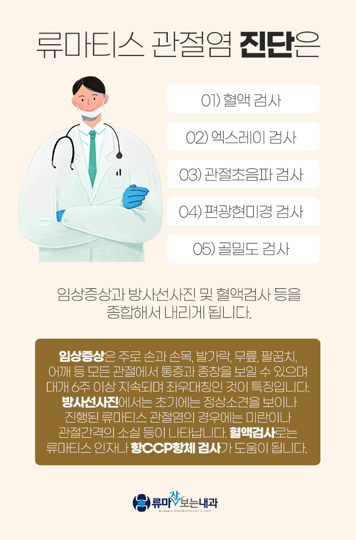 또 혈액 검사는 류마티스 인자나 항CCP 항체 검사가 있는데요. 류마티스 인자가 양성인 경우 류마티스 관절염이라 생각하시는 경우가 많은데, 정상인에게도 5% 미만에서 양성을 보일 수 있답니다. 이는 류마티스 관절염의 증상이 동반될 때만 의미가 있다고 보시는 게 좋습니다.