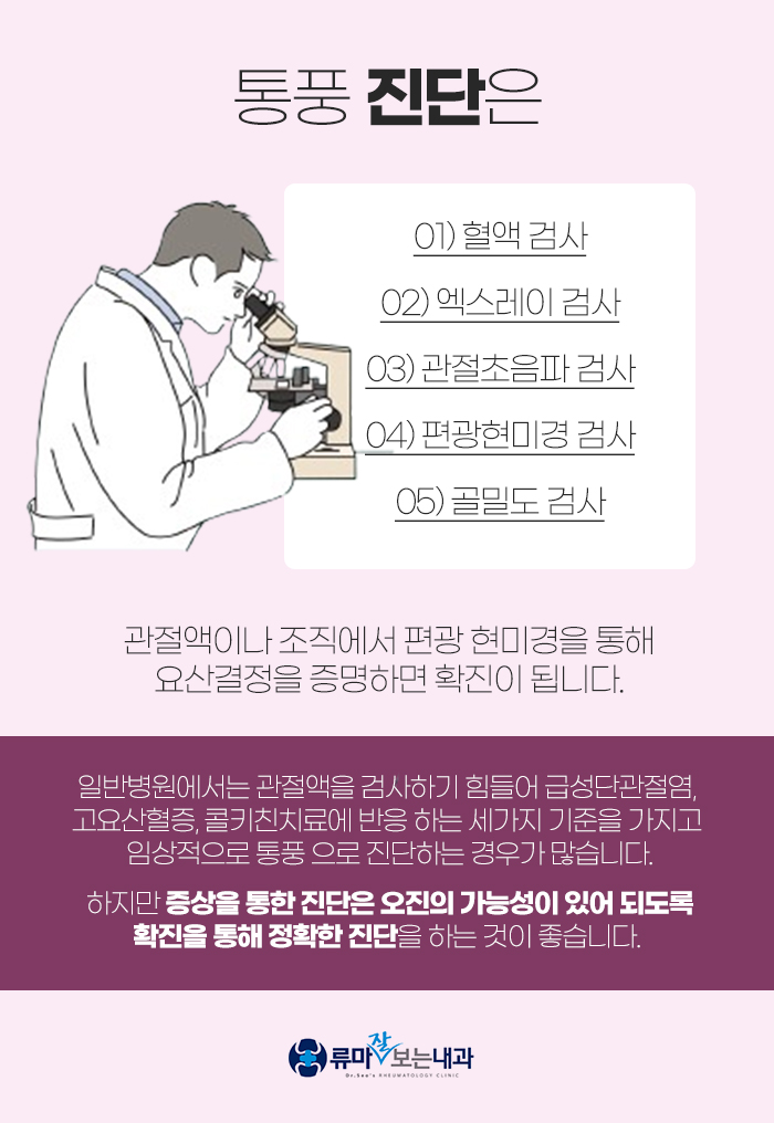 급성단관절염, 고요산혈증, 콜키친 치료 등의 세 가지 기준으로 임상적으로 통풍을 진단하게 되는데요. 이런 경우 아무래도 오인의 가능성이 있을 수밖에 없습니다. 그래서 되도록이면 확진을 통해 제대로 진단받도록 해야 하는데요.