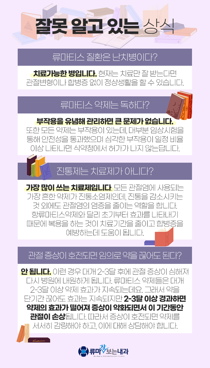 또 류마티스제가 독하다고 생각하시는 분들이 많은데요. 모든 약제는 저마다 부작용이 있기 때문에 부작용이 있고 대부분 임상시험을 통해 안정성을 통과한 만큼 심각한 부작용이 일정 비율 이상으로 나타날 경우 식약청에서 허가가 나지 않는답니다. 그래서 각 약재마다 부작용에 대해 유념하여 잘 관리할 경우 보통 큰 문제가 발생하지 않습니다. 그런 만큼 부작용이 무서워 약제를 중단할 필요가 없습니다.
