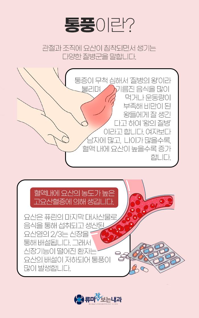 통풍은 관절과 조직에 요산이 침착되어 발생하게 되는 질환입니다. 평소 기름진 음식을 많이 먹고 운동량이 부족하여 비만이 된 왕들에게 생기는 경우가 많았던 만큼 왕의 질병이라고도 불리는 질환인데요. 유병률은 1% 내외로 알려져 있으며 여성보다 남성에게 나타나는 경우가 많고, 나이가 많거나 혈액 내에 요산이 높을수록 증가하는 것으로 알려져 있답니다.