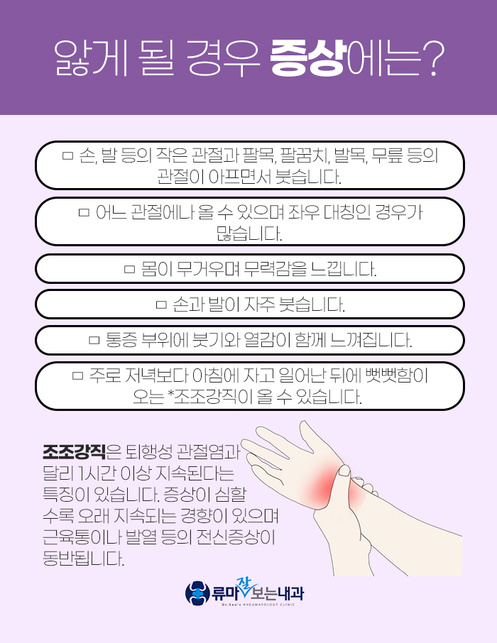 그리고 류마티스 관절염을 앓고 있는 경우 다음과 같은 증상이 나타나게 된답니다.