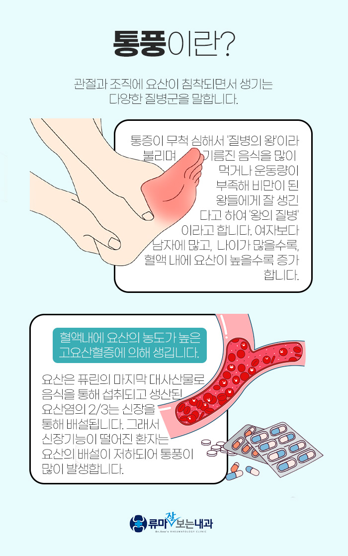 통풍은 관절과 조직의 요산이 침착되면서 발생하게 되는 질환입니다. 앓게 되면 통증의 정도가 무척 심해서 질병의 왕이라고까지 불릴 정도인데요. 기름진 음식을 많이 먹고 운동량이 부족해서 비만이 된 왕들에게 생기는 경우가 많아 왕의 질병이라고도 한답니다.