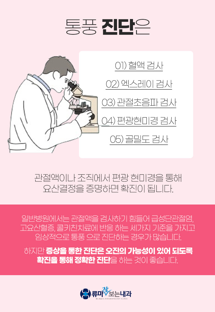 또 대구통풍이 맞는지 진단을 하게 될 때 일반 병원을 찾으시기도 하지만 대부분 관절액을 검사하는 것이 힘들어서 임상적으로 통풍을 진단하게 되는 경우가 많답니다. 그러나 증상을 통해 진단을 하게 되면 오진의 가능성이 있는 만큼 가능하면 확진을 통해 진단을 받도록 해야 하는데요.
