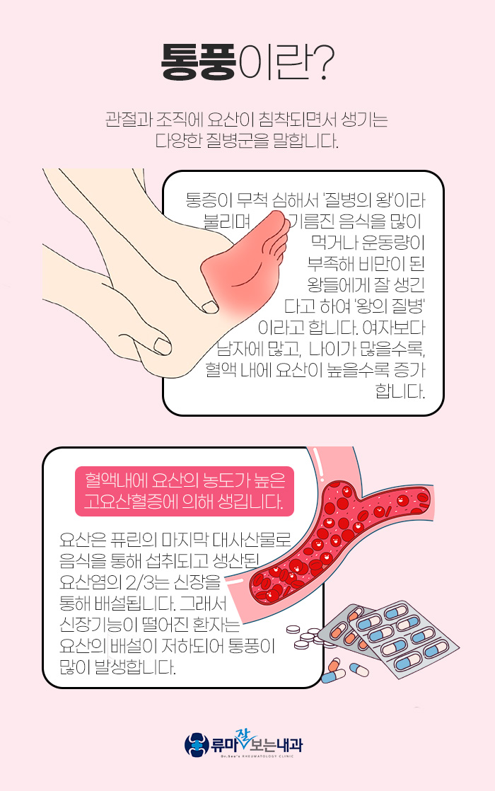 그래서 대구통풍에 대해 말해보자면 관절과 조직에 요산이 침착되면서 발생하게 되는 질환입니다. 앓게 되면 통증이 무척 심해서 '질병의 왕'이라고 불릴 정도인데요. 과거에는 기름진 음식을 많이 섭취하고 운동량이 부족한 왕들에게 나타나는 경우가 많아 '왕의 질병'이라고도 불렸답니다.