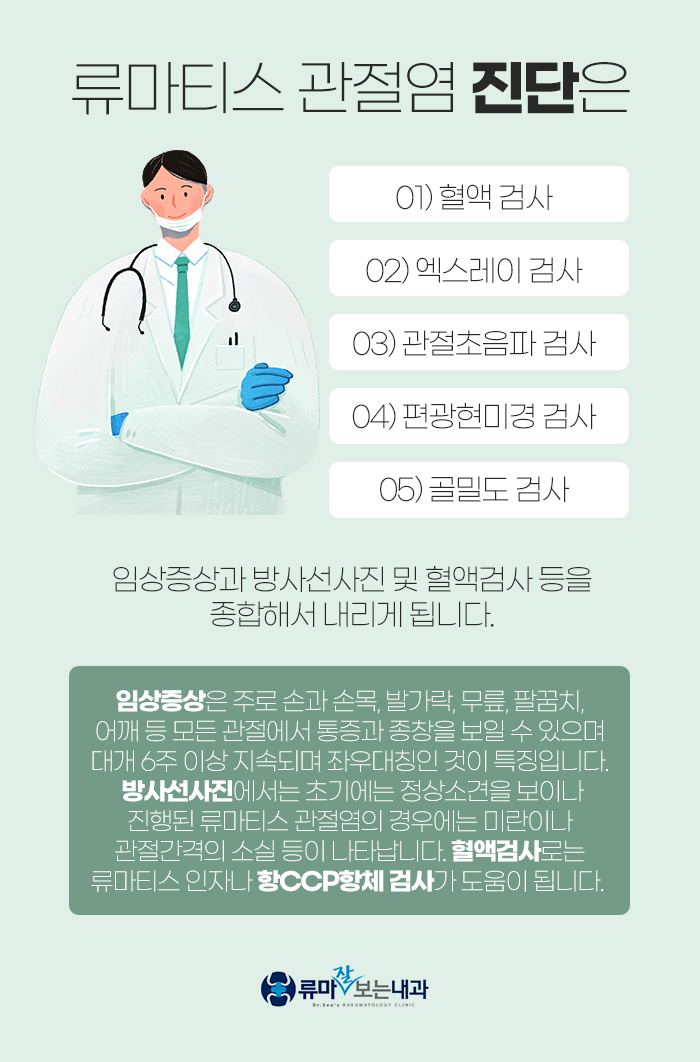 혈액 검사의 경우 류마티스 인자나 항 CCP 항체 검사가 도움이 되는데, 여기서 류마티스 인자가 양성으로 나오는 경우 류마티스 관절염이라고 생각하시는 경우가 많습니다. 하지만 정상인에게도 5% 미만에서 양성으로 나오는 경우가 있는 만큼 증상이 동반되는 경우에만 의미가 있다고 보시면 된답니다.