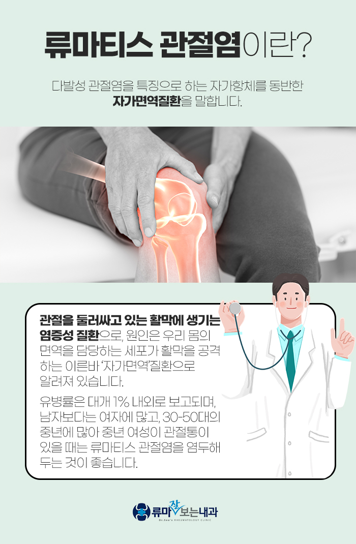 대구류마티스잘보는곳을 찾아주시는 분들을 보면 대게 류마티스 관절염으로 인한 통증을 호소하시는 경우가 많은데요. 그도 그럴 것이 류마티스 질환을 앓게 되면 류마티스 관절염이 동반되는 경우가 많기 때문입니다.