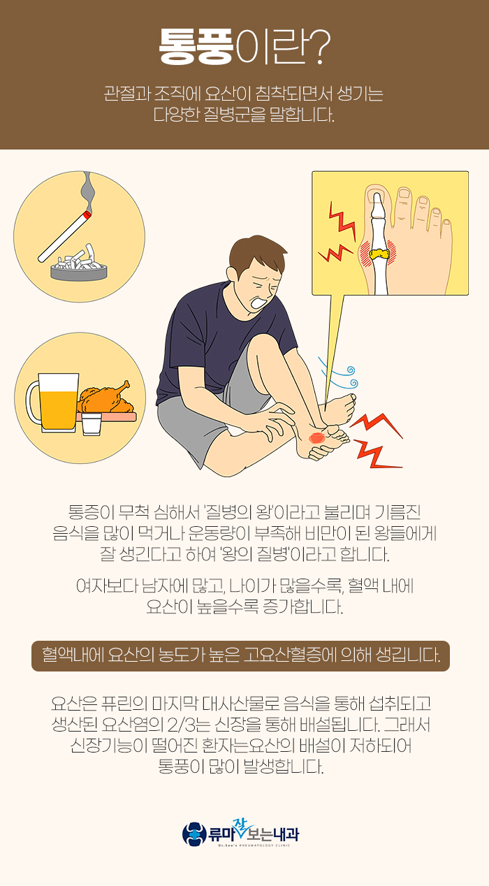 통풍은 관절과 조직에 요산이 침착되면서 발생하게 되는 질환입니다. 앓게 되면 통증이 무척 심하다 보니 질병의 왕이라고까지 불릴 정도인데요. 기름진 음식을 많이 먹고 운동량이 부족해서 비만이 된 왕들에게 생기는 경우가 많았던 만큼 왕의 질병이라고도 한답니다.
