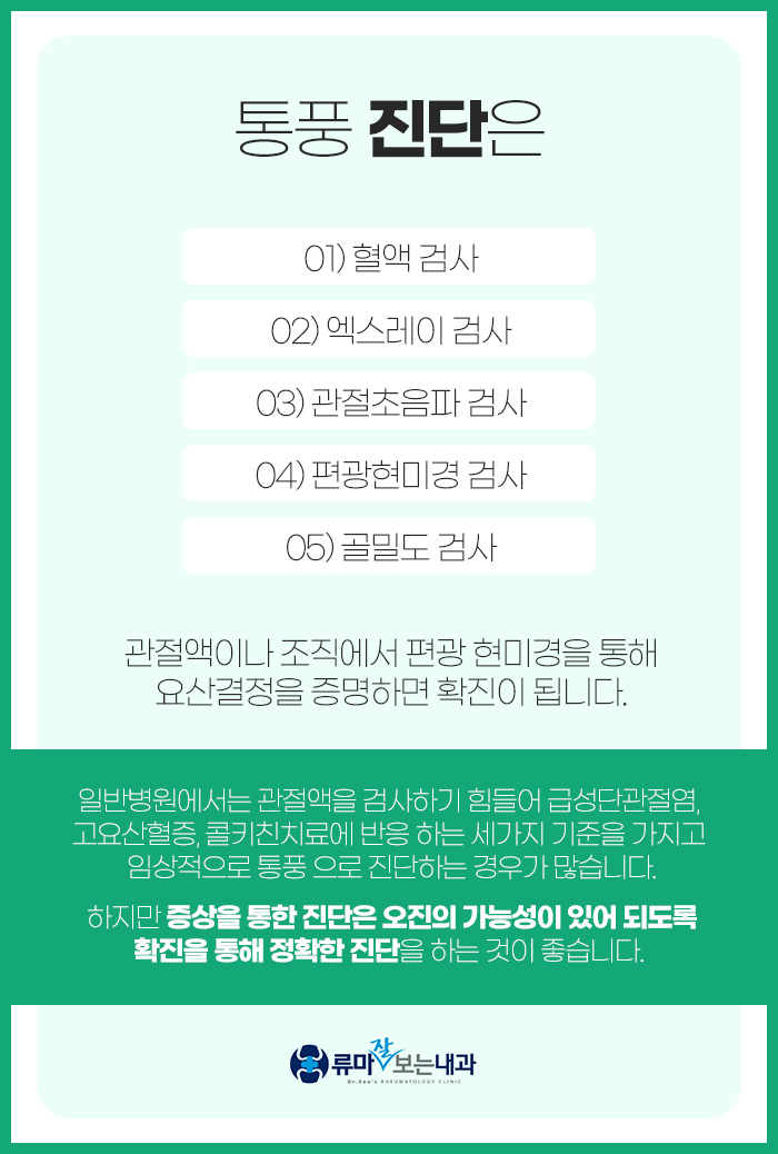 그리고 대구통풍이 맞는지 진단을 받고자 할 때는 통풍에 대해 전담하여 진료하는 곳을 찾아주시는 게 좋습니다. 일반 병원에서도 진단을 받아볼 수 있긴 하지만 보통 관절액을 검사하는 것이 힘들어서 임상적으로 통풍을 진단하게 되는 경우가 많기 때문입니다. 그러나 이렇게 증상을 통해 진단을 하게 되면 오진의 가능성이 있어서 가능하면 확진을 통해 제대로 진단을 받는 것이 좋습니다.